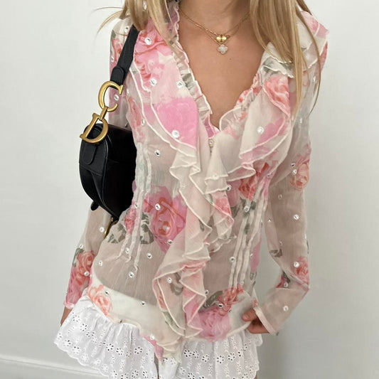 Vintage floral print long sleeve blouse top