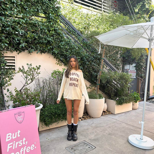 Vintage preppy coffee, beach, repeat knit sweater 🩷