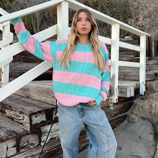 Vintage 90s Ralph Lauren rare pink and turquoise cable knit stripe sweater