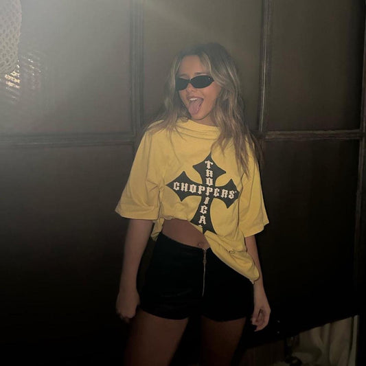 Vintage 2000s yellow West Coast Choppers graphic varsity top